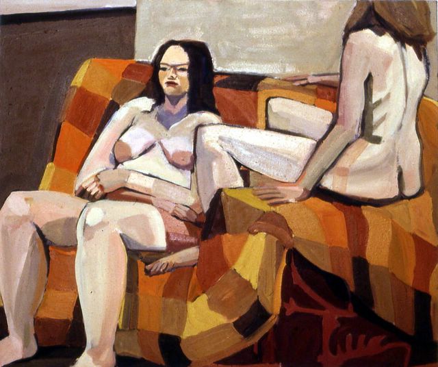 1970s Overview -- 1977 2 models on organge quilt couch 3x4' approx.